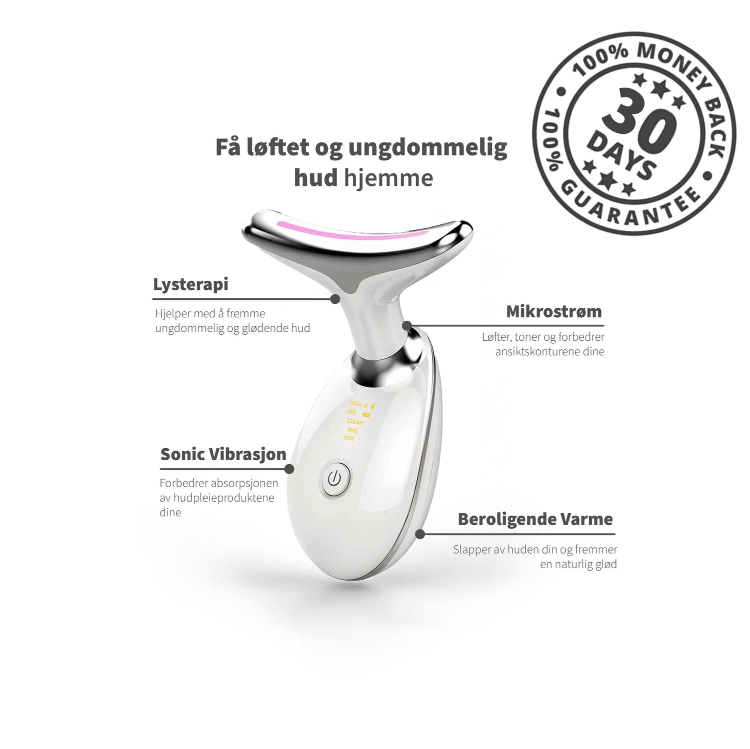 Møt AuraLift – et intelligent apparat som former ansiktskonturene, gjenoppretter hudens fasthet og gir en strålende glød på bare 5 minutter om dagen.