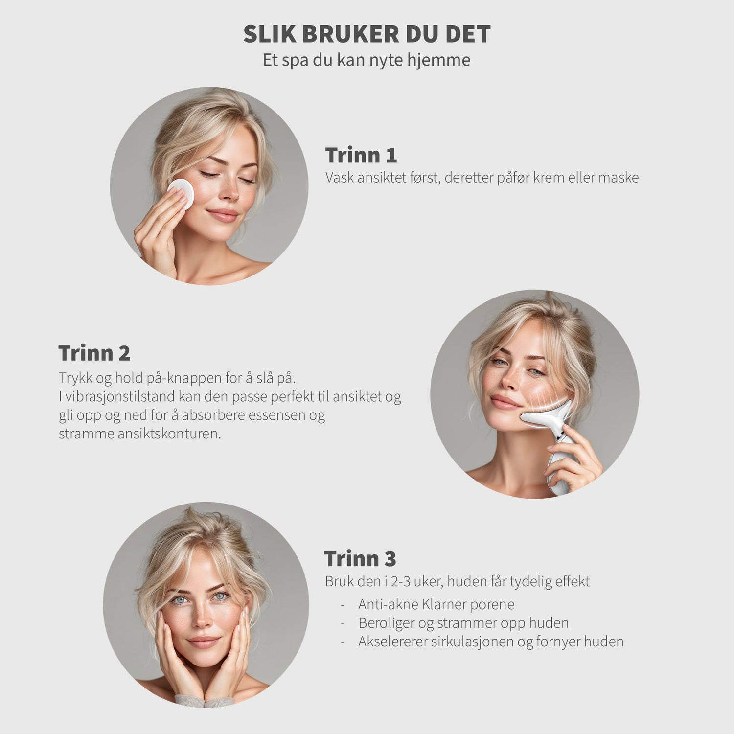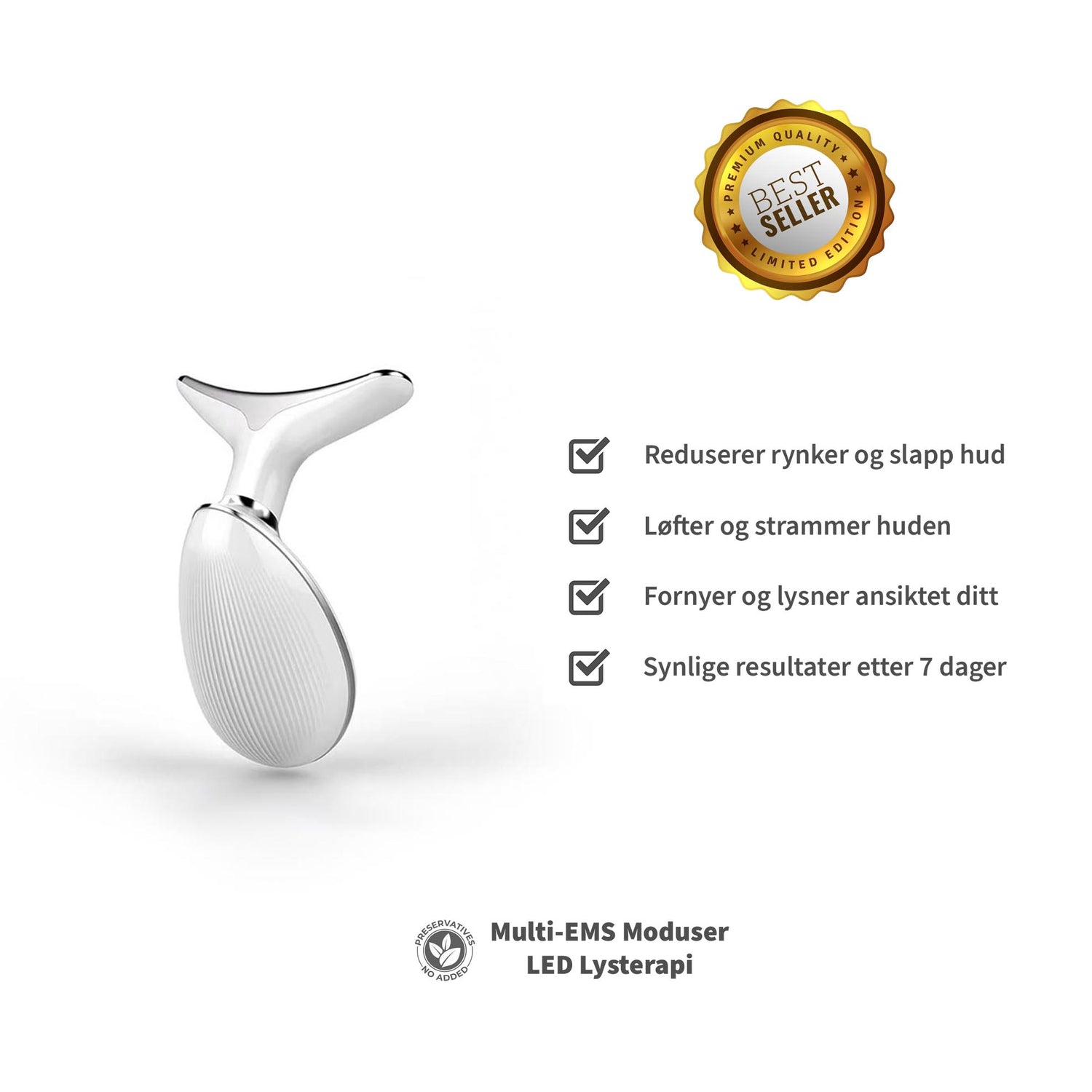 "Resultater som etter en dag på spa! Huden min er strammere, og kinnbeina har fått et løft som aldri før. Jeg bruker den med favorittserumet mitt og ser en enorm forskjell."